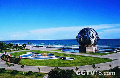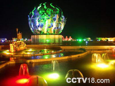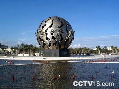 被誉为‘亚洲之最’的巨型不锈钢雕塑——“潮”在直径23米的巨大钢球上,7个仙女手执橄榄枝,亦飞亦舞,充满动感。环绕“潮”的是由5250个喷嘴组成的人工音乐喷泉。