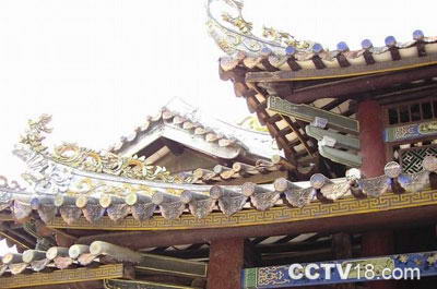 大士阁位于永安古城市井中心,坐北向南,面阔三间,宽9.7米,总进深六间,长16.4米,由两座前后相 连的重檐歇山顶建筑组成。前座为九檩无廊木构架,后 座为十一檩无廊木构架,两檐相交设承溜(天沟),形成 勾连搭屋面。以后座的三进四柱厅为中心,内部连成整 体。上层设木板及门窗装修,楼面铺设木板。下层四面 开敞。大木架采用穿斗式结合抬梁式以榫卯联结,以横 枋穿联各柱。梁枋施彩画,外檐柱头科出二跳丁头□,阁 顶各脊上有龙、凤、花草、鸟、兽等雕饰。