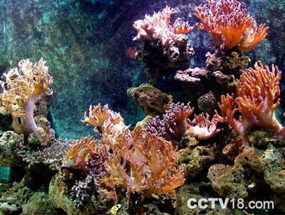 这是一座五彩缤纷、长达20米的珊瑚礁,珊瑚礁由死去的珊瑚虫堆积而成,新生的珊瑚就在死去的珊瑚骨骼上生长,珊瑚的形状美丽多姿:有像鹿角的鹿角珊瑚;有似大脑的珍珠脑珊瑚;有像树枝的海树珊瑚等等。活体珊瑚是五颜六色的,礁石区展示的都是它们的标本,死去的珊瑚都钙化了,所以大都呈现出我们现在看到的白色,而海树珊瑚和红珊瑚之所以保持红色,是因为它们体内含有大量分子结构非常稳定的铜离子。