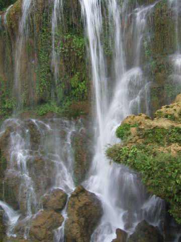 瀑布迂回曲折,参天古木间花草掩映,站在瀑布之下,水气蒸腾,上接云汉,其滚滚洪流,折而复聚,飞泻而下,连冲三关。涛声回荡于山间,声若巨雷。