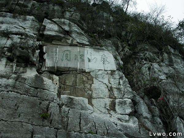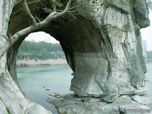 水月洞 在象鼻山的象鼻和象腿之间。距今约1.2万年前,地壳抬升,漓江缩小,加速了水月洞的发育,形成一个东西通透的圆洞。长17米,宽9.5,高12米,面积约150平方米。《象山记》载,“有石穴一,彼此可以相望,形圆而长,其半入于漓水中,水时高时下,故其穴亦时有大小”。
