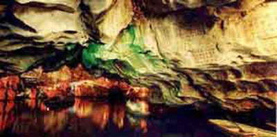 后洞形似喇叭口,有如巨龙张嘴大吼。洞口斜向天空,高约40米,宽30米,崖壁上缀满石乳、石幔、瀑布飞帘。洞后古木参天,原始森林郁郁葱葱,峡谷长约1000米,泉水汩汩,幽雅清新,仿若世外桃源。