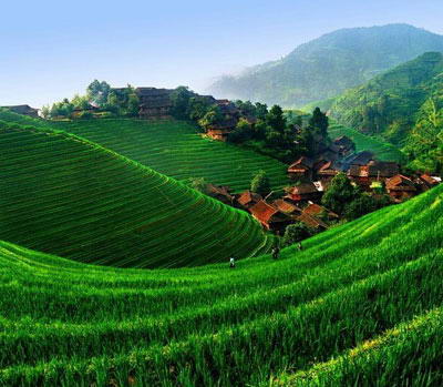 整个龙脊梯田景区山青水秀,瀑布成群,春如层层银带,夏滚道道绿波,秋叠座座金塔,冬似群龙戏水,四季各有神韵。这里的壮、瑶民族世世代代居住在青瓦木楼之中,男耕女织,淳朴善良。