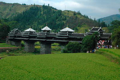 程阳风雨桥是建筑的集大成者,集桥、廊、亭三者于一身,在中外建筑史上独具风韵。风雨桥大多架设在村寨下方的溪河之上,既作交通之用,又有宗教方面的含义。它象征飞龙绕寨,以保年年风调雨顺,五谷丰登,吉祥幸福。故人们称之风雨桥、回龙桥、永济桥、赐福桥……程阳永济桥是中国惟一被列为全国重点文物保护单位的侗族风雨桥,是侗族建筑艺术的杰出代表。风雨桥坐落于广西三江侗族自治县林溪乡马安寨。始建于1912年,于1924年建成,桥长77.76米,桥道宽3.75米,桥面高11.52米。为石墩木结构楼阁式建筑,2台3墩4孔。墩台上建有5座塔式桥亭和19间桥廊,亭廊相连,浑然一体,十分雄伟壮观。据有关资料记载,该桥与我国的石拱赵州桥、铁索泸定桥及罗马的钢梁诺娃上的沃桥齐名,为世界四座历史名桥之一。