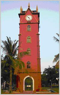 海口钟楼屹立于海口市区北部,红色的楼体与周围的绿地极为和谐,景致幽雅,风姿绰约,已经成为海口的最重要的标志性与象征性建筑物之一。