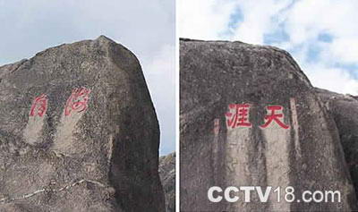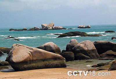 再往西约500米便是磊石群,其中一块高约10米的巨上铭刻“天崖”二字,史载为清雍正年间崖州知州程哲所题;“天涯”右侧一块尖石的顶端,刻有“海角”二字,据说是清末文人题写。这两块巨石通称“天涯海角”,该景区以此得名。