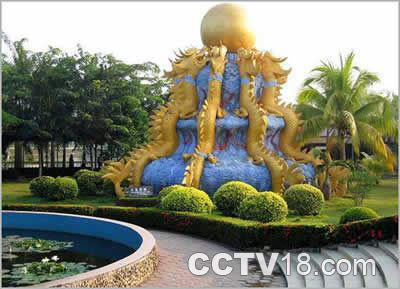 东南亚风情村的园门,是一座典型的泰国风格的建筑,其规模和艺术价值,在海南旅游也是不多见的。大门通身闪烁着瑞吉祥和之光。大门正面上部三角区内雕塑的神像和立柱上雕塑的人面狮身像同为护法神,有如中国神话传说中的韦陀,职司伏妖降魔、降吉避邪。三角区最上角的是一个倒葫芦的造型,取它的谐音:“到福禄”,意为福禄到来这里。三角两条斜边上的图案造型叫“板龙”。外侧立柱中部的图案是泰龙,,上下部的图案是变形孔雀尾。大门上部两侧三角区的图案叫神鱼如意,是长着翅膀的飞鱼。据传说神鱼眨眼睛就会地震。东南亚风情村门前两侧的两尊艺术雕塑是泰麒麟,是神话传说中造福镇邪的瑞兽。