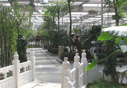 餐厅借助于现代化农业设施——智能化计算机自控温室的技术手段,通过对温度、湿度和光照的自动调节,营造出一个近乎自然的生态环境。室内充分融合了中国的园林艺术、农耕文化,人行其中,小桥流水、亭台楼榭、万木葱郁、鱼儿潜游,鲜花、瓜果争奇斗艳,真正实现了人与自然的水乳交融。