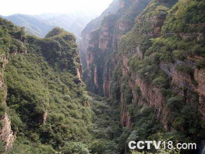 峡谷群有三大景色:一是奇峡。谷底狭深、峡岸壁立、成群出现,构成了太行奇观;二是峻峰。周围山峰都是几近90度的红崖绝壁,峰峦叠嶂,上下错落,形成了高低变化,犬牙交错的天际线;三是飞瀑。黄巢岩下有一奇特而又壮观的瀑布,瀑布不是飞流直下,而由悬崖顶一深潭中翻腾而出,山泉奔流至此,钻入一石瓮,泉水在瓮中回旋而出,从数十米高的峭壁上飞溅而上。站在瀑布之下,水声、风声骤起,一股清风寒沁人入五脏,令人备感舒畅。