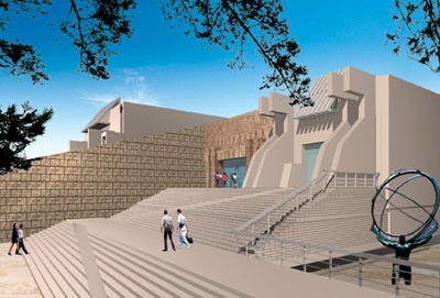 改扩建后的爱珲历史陈列馆占地10万平方米,规划为8个大小不等的功能区:大门风景区、历史陈列区、题词碑林区、将军衙门区、民俗风情区、江畔娱乐区、管理区和商服区并适当配置园林、绿地、雕塑等景观,计划全部工程分三年完成。爱珲历史陈列馆新馆工程于2000年9月2日正式开工,目前,主展厅大楼已如期完工。展馆的设计成方圆一体,主展厅大楼右圆左方,象征国土完整,可是被一个大三角一冲为二,右圆型建筑被割出城墙,寓意不平等的《爱辉条约》使中国的领土被沙俄割占了60多万平方公里。三角形的一边指向见证松,另一边指向魁星阁。