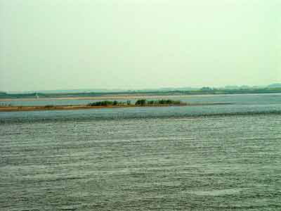 同江三江口在郡城下,从岳阳楼下乘旅游船北行7公里,即达岷江(今荆江)、沅江、湘江汇合处——同江三江口,也就是洞庭湖入长江之口,位于城陵矶附近。城陵矶,为长江的三矶之一,“大江环其东北,洞庭瞰其西南”。如今的城陵矶好一派繁荣气象。船到同江三江口,举目望去,只见荆江滚滚西来,湘江浩荡北下,汇入万里长江,莽莽东流,波澜壮阔。早有“三江到海风涛水,万水浮空岛屿轻”之名句,赞美同江三江口的壮观。由于洞庭水比长江清,这里形成一种奇异现象:清浊交汇,泾渭分明,古人称为“江会”。