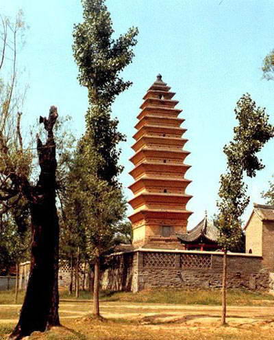 在洛阳白马寺山门外东南约200米处。东汉永平已年(公元69年),汉明帝敕建佛塔,“芨若岳峙,号曰齐云”。今存之砖塔,实重建于金大定15年(1175年)。塔为四方形密檐式,13层,通高约25米。