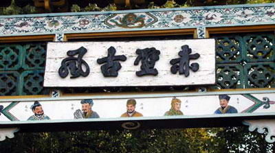 赤壁二字上有一个“鸾”字,为道教符号。据明方汝浩著《东游记》载,凡得道之人均乘青鸾游于四海。书“鸾”字于此,为镇妖之用。赤壁之战,曹操十几万人马葬入江中,阴魂不散,夜晚在江中苦泣,此符号一刻,可驱散其阴魂。《红楼梦》51回中,薛小妹有赤壁怀古诗云:“赤壁沉埋水不流,徒留名姓载空舟,喧阗一时悲风冷,无限英雄在内游。”可旁证此意。