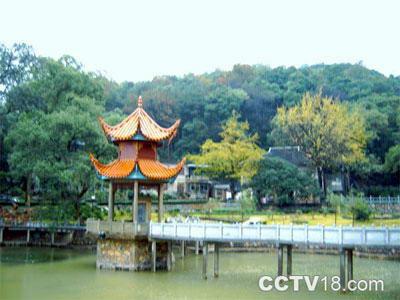 出亭上石拱桥,又有一坪,成三角形,坪边有银杏树两棵,树上挂满了白果。往右顺塘堤而行,不过五十步,就是山边石径,再前行数十步,有一小径上山,不出二十步有一长廊,廊中书法染壁。细数有李立、颜家龙等墨宝和“吾将上下而求索”等句。廊中有情侣嬉戏,也有童子读书。