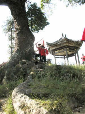 千年香樟位于桂东县新坊乡龙溪村,1928年8月,毛泽东来桂东迎还红军大队时,与朱德在龙溪村汇集回师井冈山。1967年,当地群众于原址兴建回师亭,亭右一棵樟树,已有千年,树形象一尊雄踞的狮子,高20米,树干需八人合抱,中心有直径2米的空洞,直通树顶,可见蓝天。据当地老人介绍,这棵香樟,是一棵感情树。1928年毛泽东在此开展革命活动,遭到民团追击,敌强我寡,情急智生,遂藏入树洞中,避过了敌人,转危为安。大革命时间,毛遭王明、张国焘打击,树曾一度枯黄;1935年,毛复出,又翠绿如初;1976年,毛泽东去世,叶子全落,后逐年长出新叶;1993年,毛诞生百年之际,当地村民于树下祭祀,不慎起火,树并未烧焦,不久返老还青,更加苍翠。故此,当地人们称之为“感情树”,又称“伟人树”。~,1928年8月,毛泽东来桂东迎还红军大队时,与朱德在龙溪村汇集回师井冈山。1967年,当地群众于原址兴建回师亭,亭右一棵樟树,已有千年,树形象一尊雄踞的狮子,高20米,树干需八人合抱,中心有直径2米的空洞,直通树顶,可见蓝天。据当地老人介绍,这棵香樟,是一棵感情树。1928年毛泽东在此开展革命活动,遭到民团追击,敌强我寡,情急智生,遂藏入树洞中,避过了敌人,转危为安。大革命时间,毛遭王明、张国焘打击,树曾一度枯黄;1935年,毛复出,又翠绿如初;1976年,毛泽东去世,叶子全落,后逐年长出新叶;1993年,毛诞生百年之际,当地村民于树下祭祀,不慎起火,树并未烧焦,不久返老还青,更加苍翠。故此,当地人们称之为“感情树”,又称“伟人树”。