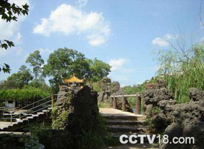 过山门不远,有半山亭。彩色的琉璃瓦顶,四根朱红立柱,亭角飞翘,亭顶系伞形,可以遮阳亦可避雨,供游人歇息之用。
