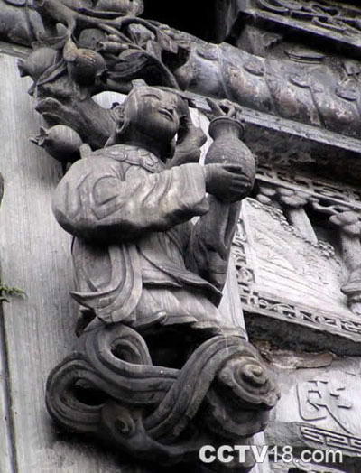 为人交口称赞的是门坊的青石浮雕。坊高10.6米,宽6.3米,重檐歇山顶,门楼形状。两侧雄狮蹲踞,石鼓对峙;顶盖斗拱飞椽,十二金鲤咬脊,葫芦攒尖;左右青石铺地平台,围夔龙、规矩龙栏杆;中间十七级石阶紧接沿河大道。面临滔滔舞水,门坊显得格外雄伟。