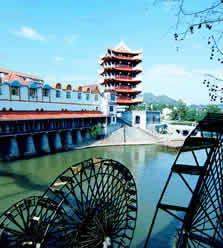 经过一段时间的实地调查和认真分析,在原龙凤岩处建一座靖州标志性建筑,成为景区的主景点。龙凤岩位于渠水和异溪交汇处,历史悠久,地貌独特,传说故事神奇,群众广知其名,如在此建定座高大建筑,一可为景区增辉,二可尽收全城风光。因此,经研究决定在此建一座阁式仿古建筑,同时,为衬托该楼,规划在楼前建一个音乐喷泉广场,广场旁配一栋两层仿古式门面楼(供景区服务经营),右侧建回廊,临河修栈道,以供游人休闲游览。