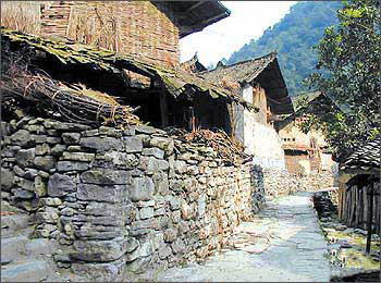 德夯村位于峡谷深处,有八十余户苗家,紧紧相依于翠谷中;统一是鳞鳞灰瓦木屋,木屋间穿插着青一色的石板路、石板坪石板桥、石板墙,透着和谐、统一的美,整个村寨显得恬适幽静。