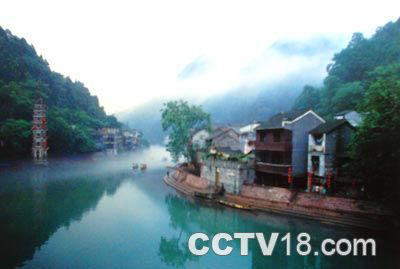 凤凰山城,位于湘西土家族苗族自治州南部的沱江之畔,群山环抱,关隘雄奇。碧绿的江水从古老城墙下蜿蜒而过,叠翠的南华山麓倒映江心。江中渔舟游船数点,山间暮鼓晨钟长鸣,悬崖上的吊脚楼轻烟袅袅,码头边的浣纱姑笑声朗朗……凤凰,犹如一副浓墨浅彩的中国山水画。当你徜徉在古城用条石砌成的岩板街时,两边的古建筑各抱地势,鳞次栉比,亭台楼阁重重叠叠,如巨龙飞舞,似雄鹰展翅。细雨声中,仿佛传来敬香人的牛皮钉鞋敲击街面,发出“叮叮”的响声,使人产生隔世之感。街道两边,有许多屠铺、染房、制作银器首饰的作坊、各种土特产的店铺和工艺美术店等。还有小吃部和酒店,狗肉汤锅香味,包谷烧得醇香使人垂涎。特别是“米豆腐”担子,穿街走巷地叫卖,叫出一派小城风情。