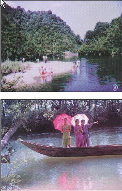 其间,支流纵横交错,洲中有水,水中有洲,洲水相间,船只穿梭,古木参天,鸟语花香,生气盎然;河中五色沙石,群活游鱼,清晰可数,清代大书法家何绍基《春江》诗云:“几处渔村乃歌,轻烟染就小峰螺。乌逢摇入潇湘路,始信春江是绿波。”