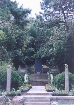 二妃墓,全称虞帝二妃之墓,在君山斑竹山西头。据<史记·五帝本纪>记载:舜"践帝三十九年,南巡狩,崩于苍梧之野,葬于江南九嶷(今宁远县九嶷山),是为零陵"。当时,舜帝的两个妃子见夫久出未归,就四处寻找来到了洞庭君山,忽闻舜帝逝世的消息,不禁肝肠寸断,忧伤成疾,不治身亡,葬于君山。二妃墓历代屡建屡毁,1979年湖南省人民政府拨款修复。墓为圆形石砌,前立石柱,上雕麒麟、狮、象、中竖墓碑"虞帝二妃之墓",其字系清两江总督彭玉麟手笔。碑前置一石刻香炉。由香炉走下几级台阶有一条1.5米宽的祭道,祭道两旁石碑上刻有东汉刘向"印心石屋"文。二妃墓前20米处的一对2.8米高的引柱上镌刻着民国七年(1918年)舒绍亮题写的一副对联: