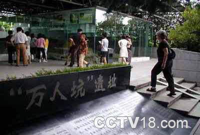 侵华日军南京大屠杀遇难同胞纪念馆址在南京城西当年日军大屠杀地之一江东门“万人坑”遗址及尸骨丛葬地之上,刻着“1937.12.13-1938.1”一行黑色大字,标明了日军南京大屠杀的时间,悼念广场有“警世钟亭”、“兴华宝鼎”、“《狂雪》诗碑”,有“历史的桥梁”、“残破城墙”和“断裂的军刀”3组建筑,以及“遇难者头颅”、“断臂”两组雕塑和长明火等主体设施。迎面石壁上刻着“遇难者300000”的黑色大字。