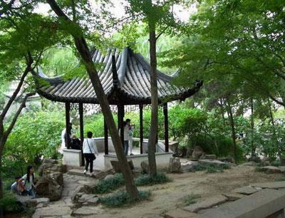 西部以假山为主,土石相间,浑然天成。山上枫树郁然成林,盛夏绿荫蔽口,深秋红霞似锦。至乐亭、舒啸亭隐现于林木之中。臀高望远,可借西郊名胜之景。山左云墙如游龙起伏。山前曲溪宛转,流水淙淙。东麓有水阁“活泼泼地”。横卧于溪涧之卜,令人有水流不尽之感。