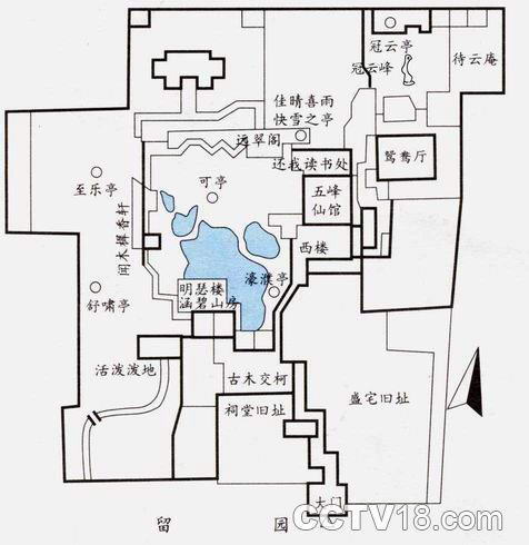 现全园占地约50亩,大致可分中、东、西、北叫个景区。其间以曲廊相连。迂回连绵,达700余米,通幽度壑,秀色迭出。中部是原来寒碧山庄的基址.中辟广池,西、北为山.东、南为建筑。假山以土为主,叠以黄石,气势浑厚。山上古木参天,显出一派山林森郁的气氛。山曲之间水涧蜿蜒,仿佛池水之源。池南涵碧山房、明瑟楼是故园的上体建筑,楼阁如前舱。敞厅如中舱。形如画舫。楼阁东侧有绿荫轩,小巧雅致,临水挂落与栏杆之间,涌出一幅山水画卷。涵碧山房西侧有爬山廊,随山势高下起伏,连接山顶闻木樨香轩。山上遍植桂花,每至秋日,香气浮动,沁人心脾。此处山高气爽,环顾四周,满同景色尽收眼底。池中小蓬莱岛浮现十碧波之上。池东濠濮亭、曲溪楼、西楼、清风池馆掩映于山水林木之间,进退起伏。错落有致。池北山石兀立,涧壑隐现,可亭亢于山冈之上,有凌空欲飞之势。