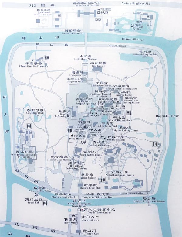 虎丘高34.3米,面积18.8公顷,四周环水,山境幽奇。入虎丘,过海涌桥,沿山路而上,一路可见断梁殿、憨憨泉、试剑石、枕头石、真娘墓、千人石、剑池、第三泉、孙武亭、望苏台等著名的虎丘十八景,每一胜景古迹都有引人入胜的历史传说和神话故事。剑池下面是吴王阖闾埋葬之地。因入葬时把其生前喜爱的“扁渚”、“鱼肠”等金剑作为殉葬品同时埋在墓里,是为剑池。篆文“剑池”二字传为王羲之所书。池深约6米,终年不干,清澈见底,可以汲饮。