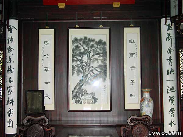馆东为昔吴云书房“平斋”,其前叠湖石假山,循蹬道至墨香阁,阁下层隐伏山中,上层突兀山巅。有花墙与他院分隔,斋阁自成院落,为全园精华,现已和南院联成一片。北院有清池一泓,金鱼成群。严冬池中绿萍如春。池畔有旱船半亭,花木峰石相映衬。此外,在味道居、两罂轩处亦各置小院-园东有曲廊小轩,今为入园门厅。