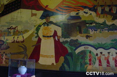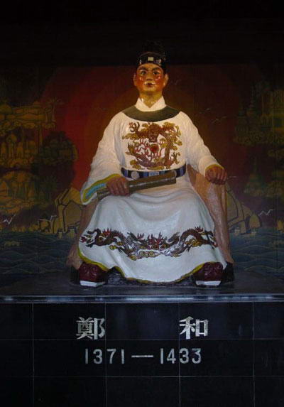 展厅分上、下两层。底层正中是一座3米高的郑和手握航海图的座像。黑色方正的大理石底座上刻着:郑和(1371——1435)几个金灿灿的大字。郑和炯炯的目光中包含着爱国主义激情和民族自豪感。他的出使,是和平之举,完成着传播和平与友好使命。