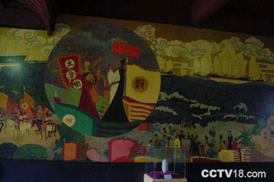 座像背后与左右两侧墙面上三幅巨型磨漆壁画《鹏起浏江》,面积达八十平方米,它不仅再现了当年郑和奉召首次从浏河下西洋,访问东南亚、东非各国出洋时的壮观场面,更具有独特的艺术效果——三幅壁画金碧辉煌,气势磅礴,画面线条流快明畅,人物栩栩如生,富有鲜明浓郁的民族风格。郑和船队中十几艘宝船“云帆高张、昼夜星驰”,无论从大厅的哪个角度看,都给人以那船是迎面驶来的感觉。
