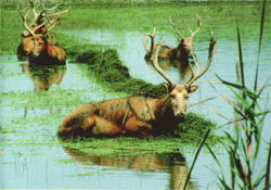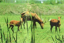由于种种原因,糜鹿野生种群已在一千年前绝迹,仅剩数百头被驯养在明、清的皇家园林,一百多年前又在一场民族浩劫中被抢掠一空。直到20世纪80年代,在世界野生动物基金会等国际组织的倡议和帮助下,这些流落海外的国宝级珍稀动物才万里迢迢从英国返回故园,在它们远祖生活过的溱湖边重新开始繁衍生息。目前世界上仅有麇鹿2000多头。