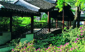 枕流亭是吴翼书额的踯躅廊的开首,廊随地形而弯,依山势而曲,在林间树隙时隐时现,若断若续。廊引人随,步移景换,把游人带到了宽敞、典雅的云锦堂,堂匾为冯牧书写。该堂借鉴苏州拙政园鸳鸯厅的设计手法,南北朝向,鸳鸯对合。堂南开半窗,有小池石景;堂北带卷棚,开落地长窗,以借景见长。暮春三月,堂前由陈从周所题的醉红坡上,繁花锦簇,映日生辉,蕴涵着唐代韩倔“一园红艳醉坡诧”的诗意。若是雨后,沁芳涧的嶙峋山石得水而活;对岸的杜鹃花着雨更妍,嫩红浅绿,清流倒悬,格外赏心悦目。