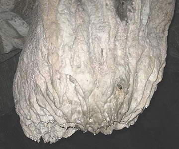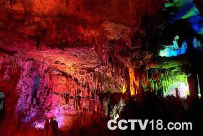 上洞的规模比中洞还要大,洞长70米、宽30米、高30米。洞形似螺壳,终年云雾弥漫,冬暖夏凉,气温终年保持23摄氏度,因而又称暖洞。环壁有奇石形成的荷花倒影、万古寒梅、绵羊、骏马、熊猫等景物,栩栩如生。石缝间细流瀑瀑,在地下形成水潭,顶部的石乳倒映在潭中,奇异天成。循石级盘旋而下,要穿过"风雷"、"波涛"、"金鼓"、"万马"4重石门。这时,你能感受到波涛远闻,风雷隐作,金鼓齐鸣,万马奔腾的意境。这里石乳滴成的奇幻景物更多,有翠绿的葡萄,橙黄的佛手,白嫩的鲜藕振翅的白鹤,还有通天石松,梅花屏风等等,千姿百态,美不胜收。