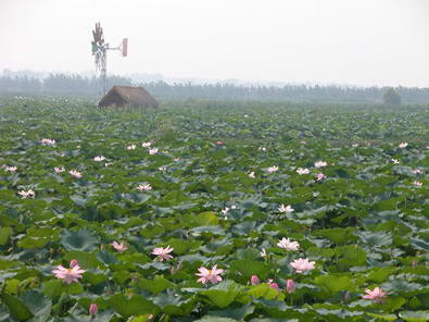 行进在前往水泗荷园的路上,一幅幅生动的画面不时地映人游人的眼帘:公路两旁的稻田里挂满了金灿灿的稻穗,圩堤边爬着又大又肥的螃蟹,湖荡里藕农们在墨绿色的荷叶下不停地淘藕。当游人踏进荷园,首先映人眼帘的是由江苏省书法家协会会员赵文澜先生书写在界碑上的遒劲有力的两个大字——“荷园”。“接天莲叶无穷碧,映日荷花别样红”。走在荷园桥上,便会使游人真正感受到自己已经与“中国荷藕之乡——宝应”亲密接触了。站在荷园岸边,放眼望去,眼前呈现出一片浩瀚的荷花荡。在耀眼的阳光下,万亩荷花荡的尽头则是碧绿—片。座落在荷花荡里的四座风车,风叶迎风转动,有着—一种执着不阿的精神,远远望去,好似四只巨大的河鸟在空中翱翔。田埂小路旁的芦苇、蒲草、睡莲等自然景观更是尽收眼底,妙不可言。