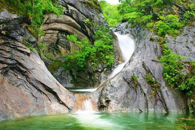 谷内“树在石上生,石在水中长,瀑在岩上飞,泉在山间唱。”谷口是巧石嶙峋,溪流潺潺,枝叶扶疏,潭静池幽;深入其中,流泉随山势起伏,回旋、转折,有时一如素娟白练,随意漫流;有时又如游龙飞舞,飘逸毕现;再前行,高百米的瀑布无所顾及地喧泄腾嚣,张扬着个性。于是峡谷里水气、雾气交织升腾,彩珠晶体相互碰撞,俨然一部雄浑跌岩而又充满野性的交响曲。