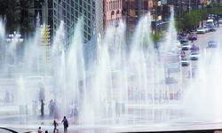 喷泉主题为团结、发展、欢乐、祥和,12种水型按音乐不同自由组合,变幻无穷,配合8盏大型彩色遥控灯,令整个广场艳丽多彩,形成有声有色的壮观场面。通过积具现代化感的框架雕塑,大型音乐喷泉,简洁舒朗的绿地景观,共同组成鞍山人民继承传统、把握现在奔向未来盛世的壮观乐章。