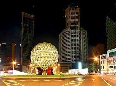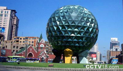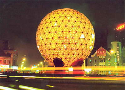广场中央有巨大的水晶球,建于1996年,是根据币长薄熙来的构思设计的。它是祥和、吉祥的象征。