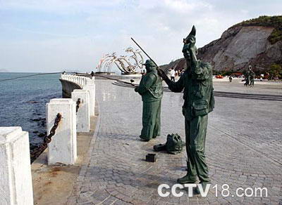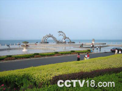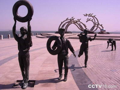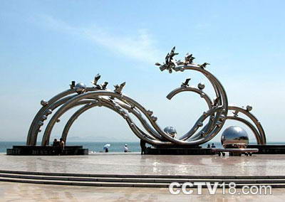 这座雕塑名为“海之韵”,广场的名字就是因它而得。它由五根白钢主管构成,好似腾飞的巨龙,翻滚的波浪极富动感和通透性,是国内最大的白钢雕塑。主管上的21只飞翔的海鸥象征着飞向21世纪,50个大小不同的球体寓意着建国50周年。