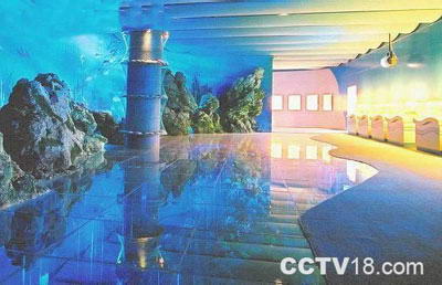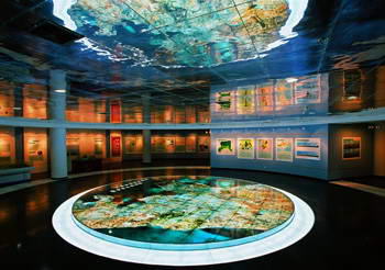 馆内大堂顶部为圆形穹顶。10根倒方锥形黑色花岗岩立柱撑起35米高的玻璃穹顶,二、三、四层的环廊为双层玻璃板、白钢护栏围合。天花为黑色网眼式铝合金扣板加磨砂玻璃,地面为双层夹胶发光玻璃地面。从天花到地面设有10000多盏灯具,全部隐蔽设置,可以组合成几十种图案的灯光变化。大堂一侧设有一座鱼骨式结构的透明玻璃楼梯,连接至二层环廊,精巧而华丽。大堂中心设有“天圆地方”雕塑,在一个2米见方的黑色花岗岩基座上,矗立着一个直径2米的空心内发光玻璃球体,球体由188片进口特白玻璃粘和而成,晶莹而华贵。基座的正面铭刻着两行金字:“同在一个星球,共爱一方热土”,显示出这尊雕塑的主题,基座两侧刻着大连市荣誉公民的名字。