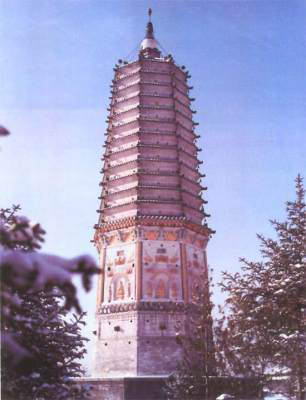 该塔为13层密檐八角形砖塔,高约33米。整体可分地宫、塔座、塔身、塔檐、塔刹5部分。地宫在塔座下,乃埋舍利之处;塔座为八角形仰伏莲须弥座,通体砖砌,周边嵌石条,高1.7米,每面宽5.5米;塔身每面都辟佛龛,龛上雕有卷草、海棠花纹图案及造型美观的伞盖、飞天等,龛内凸起的莲座上有身披袈裟的坐佛,龛两侧立有协侍。塔檐下有砖雕斗拱,上有瓦垄,角脊有套兽、坐兽,13层塔檐层层内收,最后成八角攒尖的塔顶。塔顶立前金属刹杆,串有葫芦形宝珠,以8条铁索连着角脊。全塔挺拔壮观。1985年维修时,发现此塔为空心,为全国同类建筑中所仅见。