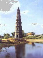 千佛塔位于德州平原县以北五里,崔家庙村东约五十米处,东靠津浦铁路十米,西靠国防公路二十米,塔身为八棱柱形,四面有窗,全高二十六米,青砖砌壁,七级节次,上下均称,蔚然秀观。