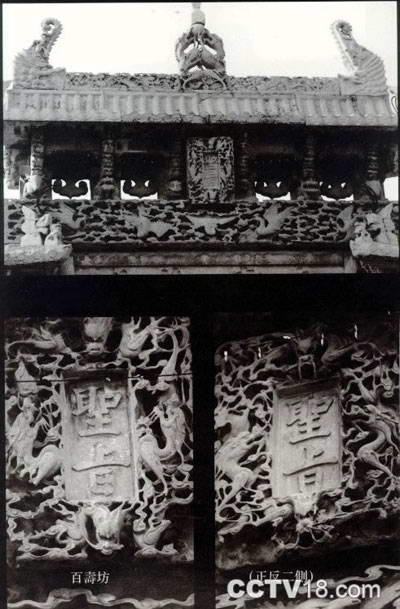 百寿坊俗称朱家牌坊。位于百狮坊西南约百米处。1765年为翰林院孔目赠儒林郎朱叔琪妾孔氏建。因前后枋心边沿浮雕百个不同篆体的“寿”字得名。雕刻内容除狮、龙、牡丹外,还有鹤、凤、梅花等奇花异卉。其构筑精巧宏伟,雕刻精致生动,可与百狮坊媲美。甭说那矫捷神俊的雄狮,绕柱回舞的蛟龙,满饰额枋的牡丹,单说那正间上下额枋祥云间翩翩飞舞的五只透雕仙鹤和次间上额枋浮雕的引颈鸣唱、相对翱翔的双凤,就有无穷的魅力。