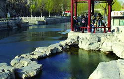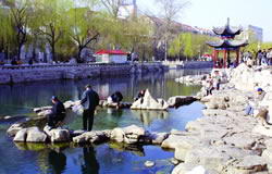 白石泉在黑虎泉东北,南护城河北岸。此泉是清代乾隆年间疏浚护城河时发现的,因泉周围有许多白石出没水中而得名。白石泉后来湮没,直至1984年建环城公园疏浚护城河时才得以复出。现该泉以白石砌岸,恰似一块嵌于护城河中的白玉。