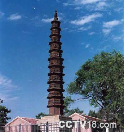 在聊城流传着一首家喻户晓的民谣:“东昌府,有三宝,铁塔,古楼和玉皋。”被人们誉为三宝之一的铁塔,位于聊城东关运河西岸、原护国隆兴寺东南角,铁塔本身没有铭记,地方文献中亦无记载,从塔的形制与浮雕风格上分析比较,初建年代在北宋早期,是本市现存最古老的建筑。铁塔为八角形楼阁式佛塔,现为12层,塔高15.8米,由塔身、塔座两部分组成。塔座为石砌正方形上下叠涩不对称式须弥座,高2.90米,底边长3.17米,占地10.50平方米。塔身用生铁仿木构分层铸造,逐层迭装而成。铁壳中空,厚6-10厘米不等。楼身共12层,倚柱、斗拱与一层相同。各层都有腰檐平座,平座均为四铺作单抄计心造,周绕栏杆。腰檐仿木檐铸造有檩枋、檐椽、飞椽、瓦垄及斜脊等。塔身逐层收分,塔顶置仰莲葫芦宝瓶式塔刹。聊城铁塔,目前已是我国为数不多的铁石建筑,不论在建筑风格,还是在石雕艺术上,都有较高的研究价值。