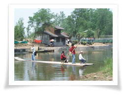 水上游乐园仿佛一个流动着的风景,游客可乘竹排漂流,可乘乌篷船赏景,一群白鹭在河面上竞相嬉戏(竹林便是它们的栖息地),更让游客心旷神怡。