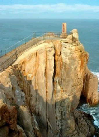 成山头,又名天尽头。位于胶东半岛最东端,地属荣成市龙须岛,海图上称山东高角。此处峰崖秀丽,海浪呼啸,顽石遍布。成山头,因处于成山山脉的最尽头而得名。成山古称“召山”。《三齐略记》中说,始皇东巡成山,欲造桥渡海,观日出处,因此命神人召太行山石东来。神人执鞭驱石,此而止,故成山诸峰多豁裂、多锈渍,如鞭痕,似淌血。据《史记》记载,秦始皇统一中国后,曾先后两次登临过成山头。第一次在公元前219年,目的是“礼祠名山大川及八神,求仙人羡门之属。”现在,成山头峰巅有残碣一块,高56厘米,宽127厘米,厚46厘米。据说就是秦始皇这次东巡时留下的遗物。第二次在公元210年。秦始皇这次来成山头是为了寻求长生不老药。据史书记载,为纪念秦始皇二次东游成山头,建立了始皇庙。当时的庙宇气势宏伟,工程浩大,曾冠一时之首。后来,有的因年久失修而坍塌,有的毁于战火,后几经重修,已失去本来面貌。现存的庙宇为清嘉庆末年(1821年)徐复吕主持重建起来的。