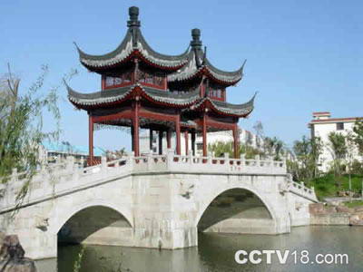 出“秋水园”伴月亭门洞,仅数步,便是石垒拱桥“南塘第一桥”,这座桥原是木桥,清嘉庆四年(公元1799年)重建为石拱桥。南北流向的横泾港和东西流向的南桥塘是南桥镇的母亲河,而南塘第一桥就是横跨南桥塘上的最雄伟最美观的一座桥,现在南桥塘几乎被填埋殆尽,而“南塘第一桥”在修建古华公园时被迁移过来,仍保持古桥风貌。南堍两侧立诗碑一块,刻有清代汝霖的赞桥绝句:“先德重勤问俗轺,漫随竹马人风谣,南塘春色浓于酒,佳句争传第一桥。”